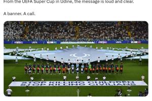 歐足聯(lián)官方在社交平臺上配文寫道:“來自烏迪內(nèi)的歐洲超級杯現(xiàn)場,這則信息響亮且清晰,一面標(biāo)語,一次號召?!边@一標(biāo)語并沒有明確針對的對象,但歐足聯(lián)在活動期間還邀請了兩名來自巴勒斯坦的難民兒童參加頒獎儀式,指向性十分明確。