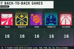 下賽季背靠背次數(shù)16次的球隊(duì):76人、掘金、太陽、黃蜂、奇才