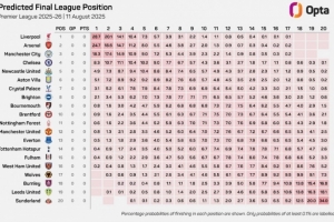 2025-26賽季英超聯(lián)賽開賽在即,看看Opta超級計算機對新賽季英超的預(yù)測。