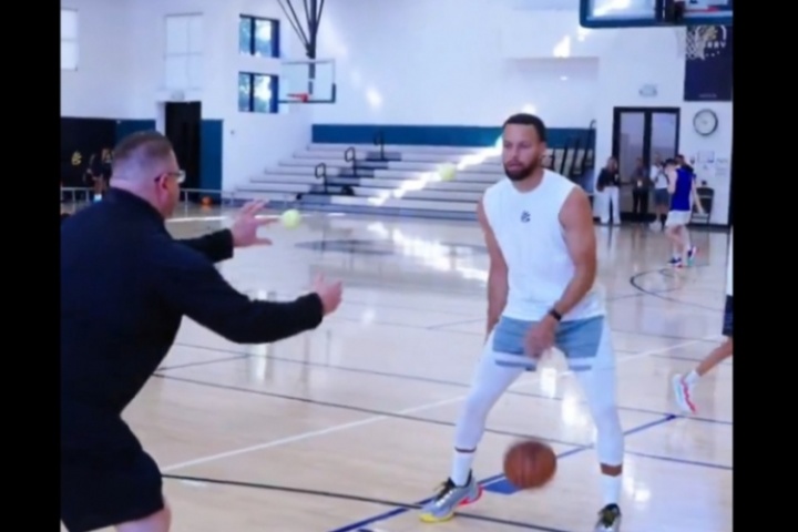 胯下運(yùn)球中扔接網(wǎng)球,隨后投射
