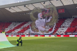 體育資訊8月16日訊 桑德蘭回歸英超后迎來首戰(zhàn),與西漢姆的比賽正在進行當中,黑貓球迷們打出巨幅TIFO,給球隊打氣。