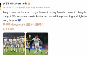 客場(chǎng)戰(zhàn)平,結(jié)果艱難。衷心感謝今晚來到杭州的每一位球迷。我們知道我們可以做得更好,我們將繼續(xù)拼搏,為你們戰(zhàn)斗到最后一刻。