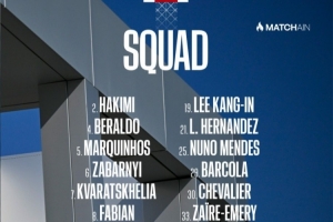 后衛(wèi):2-阿什拉夫、4-貝拉爾多、5-馬爾基尼奧斯、6-扎巴爾尼、21-盧卡斯-埃爾南德斯、25-努諾-門德斯、51-帕喬