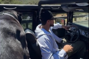 體育資訊8月19日訊 近日單身的太陽(yáng)隊(duì)球星德文-布克駕駛悍馬出游,狗狗陪伴在他的身邊。