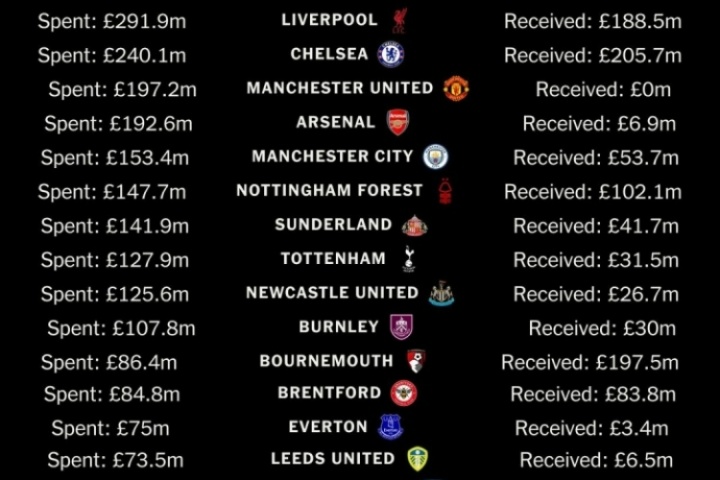 體育資訊08月19日訊 TA統(tǒng)計(jì)了截止至8月18日英超各隊(duì)的夏窗收支情況,其中利物浦2.9億鎊支出居首 曼聯(lián)凈支出1.97億鎊最多。