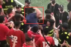 據(jù)現(xiàn)場球迷拍攝的視頻顯示,看臺上發(fā)生了球迷沖突。其中一名藍衣服的揮拳打完對方,隨后轉(zhuǎn)身走了。