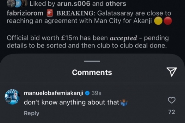 阿坎吉出現(xiàn)在羅馬諾的ins評(píng)論區(qū),他評(píng)論道:我什么都不知道。