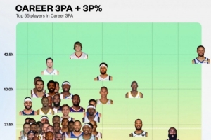 體育資訊8月21日訊 近日,數(shù)據(jù)媒體NBA University曬出一張NBA歷史上三分出手次數(shù)排名前55名的球員生涯三分命中率統(tǒng)計(jì)圖。