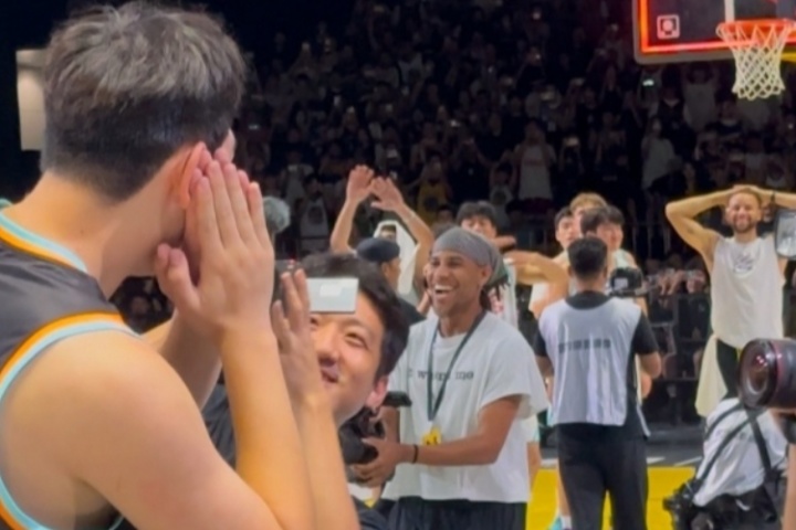 庫(kù)里雖然第一時(shí)間很無(wú)奈,但之后還是笑呵呵地跟朱偉皓一起“NightNight”: