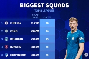 體育資訊7月8日訊 《轉(zhuǎn)會市場》統(tǒng)計了當(dāng)前五大聯(lián)賽一線隊人數(shù)最多的球隊情況,切爾西無懸念居首。