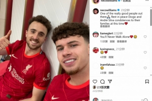 內科-威廉姆斯曬出合影并悼念若塔:“一位真正的好人????安息吧,若塔和安德烈-席爾瓦,在此刻向他們的家人致以哀悼??”