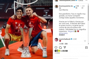 布努曬出與拉基蒂奇的合照,配文:“你非常了不起。能與你共度那些美好時刻,是我莫大的驕傲和榮幸?!?/p>