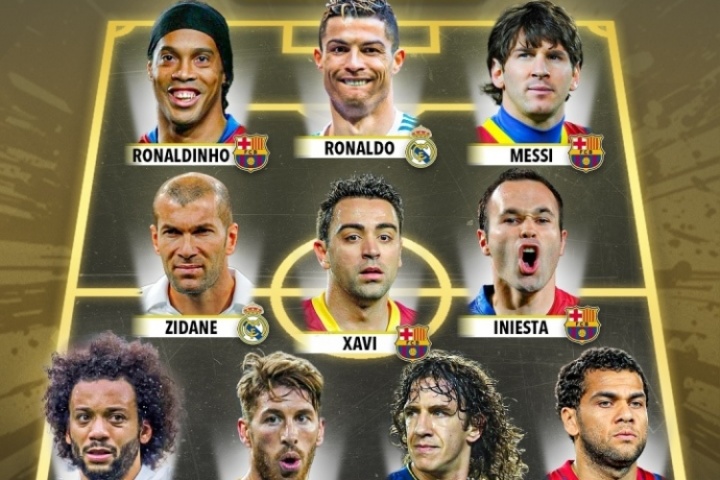 中場(chǎng):齊達(dá)內(nèi)(皇馬)、哈維(巴薩)、伊涅斯塔(巴薩)