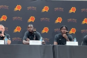體育資訊7月8日訊 今天,太陽(yáng)為球隊(duì)新秀舉行了新聞發(fā)布會(huì)。10號(hào)秀馬盧阿奇(圖左二)接受了采訪(fǎng)。
