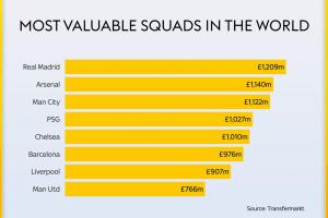 體育資訊08月23日訊 英國天空體育援引德轉(zhuǎn)數(shù)據(jù),列出了全球俱樂部球員總身價(jià)排名,皇馬以超12億鎊的身價(jià)位居首位。