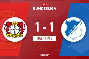 上半場補時4分鐘,勒沃庫森1-1霍芬海姆。