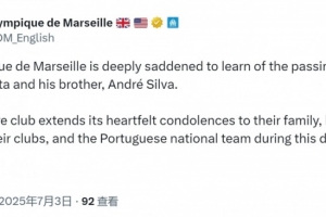 馬賽社媒寫道:“馬賽俱樂部對若塔和他的兄弟安德烈-席爾瓦的去世深感悲痛。在這個(gè)艱難時(shí)刻,馬賽全體成員向他們的家人、親友、俱樂部和葡萄牙國家隊(duì)致以最誠摯的慰問?!?/p> 利物浦前鋒若塔因車禍離世,年僅28歲