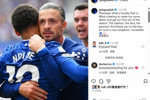 本場比賽埃弗頓新援格拉利什首發(fā)出戰(zhàn)送出兩次助攻,賽后也當(dāng)選英超官方球迷票選全場最佳。格拉利什在社媒曬出與隊(duì)友慶祝的照片,配文寫道:“這是多棒的一個(gè)周日!完成主場首秀并且取得賽季首勝的感覺太好了!這座球場、這里的球迷們、這里的激情!感謝球迷們對(duì)我的歡迎,真的難以置信!”