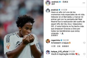 恩德里克社媒寫道:一年前,我經(jīng)歷了人生中最特別的時(shí)刻之一。 在伯納烏完成首秀,并打進(jìn)自己身穿皇馬球衣的首粒進(jìn)球,實(shí)現(xiàn)了那個(gè)來自巴西塞烏阿蘇(戈亞斯州瓦爾帕萊索)的孩子的夢想。 這段故事才剛剛開始,感謝上帝賜予我正在經(jīng)歷的一切祝福。 ??????