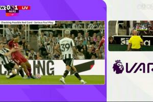 VAR介入,主裁觀看回放,判罰紅牌。