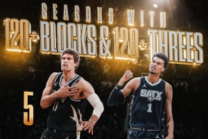 單賽季同時(shí)達(dá)成120+三分和蓋帽:大洛5次,文班2次,此外沒人能多次做到。