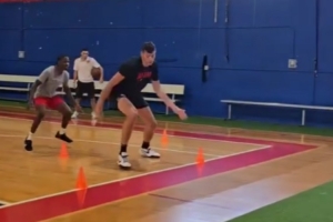 視頻中,克林根和小個球員一起進行腳步訓(xùn)練,開拓者官博配文道:“??6尺vs7尺,來和大根一起練練腳步?!?/p>
