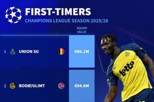 體育資訊8月29日訊 德國轉(zhuǎn)會市場統(tǒng)計了歐冠新軍的身價,并列出榜單,圣吉羅斯8610萬歐居首,凱拉特1280萬歐最低。