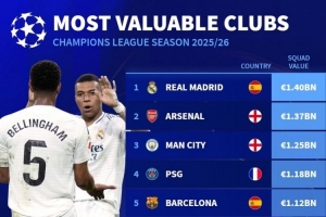 本賽季歐冠參賽球隊(duì)身價(jià)排名: