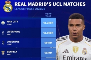 體育資訊8月29日訊 本賽季歐冠聯(lián)賽階段對陣抽簽結果出爐,德國轉會市場列出了皇馬對手的身價。