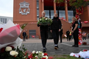 她們還代表球隊(duì)獻(xiàn)上了一個(gè)花圈,加入到過(guò)去幾天里放置在安菲爾德球場(chǎng)外的大量悼念物品之中。