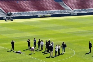 本周五,一張頗具超現(xiàn)實意味的照片在網(wǎng)絡(luò)上流傳開來。照片中,俱樂部主席拉波爾塔仰面躺在球場中央的草坪上。旁邊還有幾位攝影師和一位負(fù)責(zé)俱樂部社交媒體的工作人員,這可能是為了宣傳球隊在獲得相應(yīng)區(qū)域開放許可后重返主場的活動。