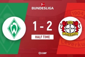 傷停補(bǔ)時(shí)7分鐘。上半場(chǎng)比賽結(jié)束,不萊梅1-2勒沃庫森。