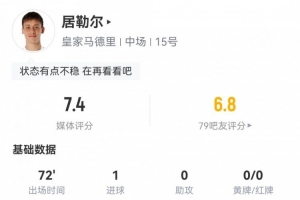 體育資訊8月31日訊 西甲第三輪,皇馬暫2-1領(lǐng)先馬洛卡。此役居勒爾首發(fā)72分鐘被換下,球員全場(chǎng)重點(diǎn)數(shù)據(jù)如下↓