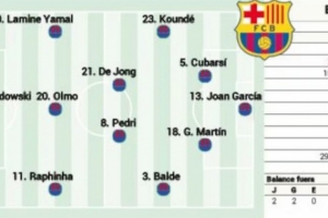 體育資訊8月31日訊 北京時間周一凌晨的西甲第3輪比賽,巴薩將前往客場挑戰(zhàn)巴列卡諾?!栋⑺箞蟆穼Ρ緢霰荣愂装l(fā)陣容進(jìn)行了預(yù)測,庫巴西和杰拉德-馬丁搭檔中衛(wèi),萊萬、亞馬爾和拉菲尼亞組成進(jìn)攻三叉戟,加維缺陣。