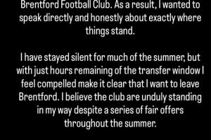 這個夏天我大多保持沉默,但在轉(zhuǎn)會窗僅剩數(shù)小時之際,我不得不明確表示:我希望離開布倫特福德。盡管整個夏天收到了多份合理報價,我認(rèn)為俱樂部正在過度阻撓我的轉(zhuǎn)會。