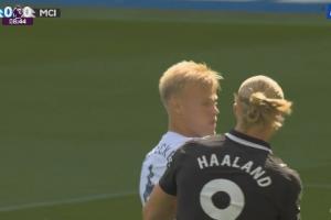 體育資訊08月31日訊 曼城vs布萊頓第9分鐘,哈蘭德單刀力量太小被沒(méi)收!隨后回頭和跟防的范赫克頂牛!