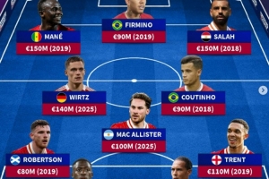 馬內(nèi)(2019年,1.5億歐)、菲爾米諾(2019年,9000萬(wàn)歐)、薩拉赫(2018年,1.5億歐)