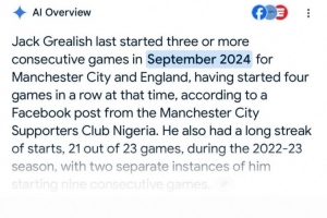 格拉利什通過(guò)社媒曬出了自己搜索自己上次連續(xù)3場(chǎng)首發(fā)的信息,顯示他上次連續(xù)3場(chǎng)首發(fā)還是2024年9月。他對(duì)此點(diǎn)評(píng)道:“終于又能連續(xù)3場(chǎng)首發(fā)的感覺(jué)真棒!”