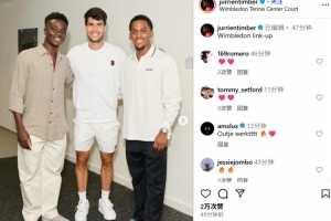 阿森納球員廷伯和薩卡也現(xiàn)場觀看了本場比賽,前者也曬出他們和阿爾卡拉斯的合照并配文:“溫網(wǎng)公開賽。”