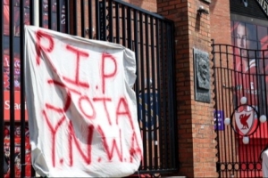 有利物浦球迷來到安菲爾德球場外,并掛上標(biāo)語:安息吧若塔,你永不獨(dú)行。