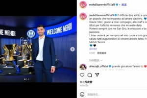 “國際米蘭將永遠留在我心中。帶著感激之情,我向你們所有人告別,并祝愿你們未來贏得更多榮譽!滿懷感情地這么做。——梅赫迪-塔雷米。”