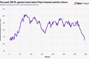 以連續(xù)38場(chǎng)聯(lián)賽的積分而論,這也是曼城自2016年11月以來(lái)的最低積分,而彼時(shí)瓜帥剛剛執(zhí)教了11場(chǎng)比賽。