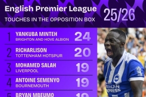 本賽季英超在對方禁區(qū)觸球次數(shù)榜: