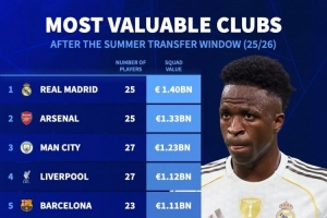體育資訊9月3日訊 德國轉(zhuǎn)會市場統(tǒng)計了夏窗結(jié)束之后各俱樂部的球員身價,并列出榜單,皇馬14億歐居首,阿森納、曼城二三位,曼聯(lián)7.48億歐排名第10位。