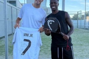 合照中科埃略獲贈維尼修斯的簽名球衣,而維尼修斯則是手持籠式網(wǎng)球球拍。
