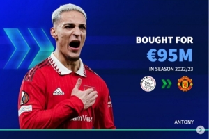 2022年夏窗,曼聯(lián)以9500萬歐元從阿賈克斯引進(jìn)安東尼,今夏以2200萬歐將其賣給貝蒂斯。凈虧7300萬歐。