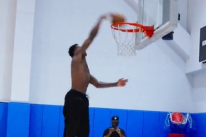 視頻中馬瑟林赤裸著上身進(jìn)行有球訓(xùn)練,他的打板大戰(zhàn)斧劈扣讓人賞心悅目,節(jié)奏變化下的跳投也是把握十足。