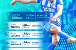 米爾納在對(duì)陣曼城的比賽中破門,以39歲239天成為布萊頓英超最年長(zhǎng)進(jìn)球者。