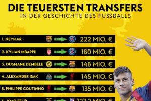 體育資訊09月04日訊 夏窗已經(jīng)結(jié)束,德天空統(tǒng)計(jì)了最新的足壇歷史最貴轉(zhuǎn)會排行榜,其中,伊薩克位居第四,維爾茨位列第八,內(nèi)馬爾仍居首。