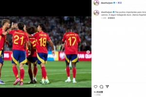 他也在賽后通過社媒曬出和隊友們慶祝的合照,并配文:“開啟我們(世預賽)旅程的關(guān)鍵3分。讓我們繼續(xù)努力。西班牙加油!”